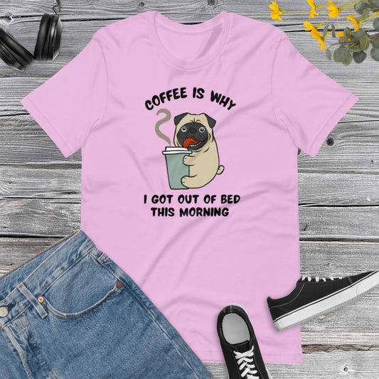 Coffe is why I got out of bed this Morning, Pug Dog coffee cup Cartoon, Dog Lover, Pug Dog, Coffee Lover Unisex t-shirt